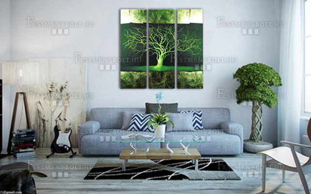 A fa, az ember és a mindennapi élet elválaszthatatlan hármast alkot. Ezen az egyedülálló faliképen a fa motívum az élethez létfontosságú védelmet, erőt és szépséget testesíti meg. A szinte minden kultúrában hasonló jelentéssel bíró kézzel festett falikép kompozíciója a zöld és az ezüst tónusokra épít. A zöldet a lakberendezők a legpihentetőbb, legnyugodtabb színnek tartják, az ezüsstel való kombinációjával a lakberendezésben különleges, luxushatást érhetünk el. A falikép plasztikus megjelenése a vizuális élmény alapvető összetevője.